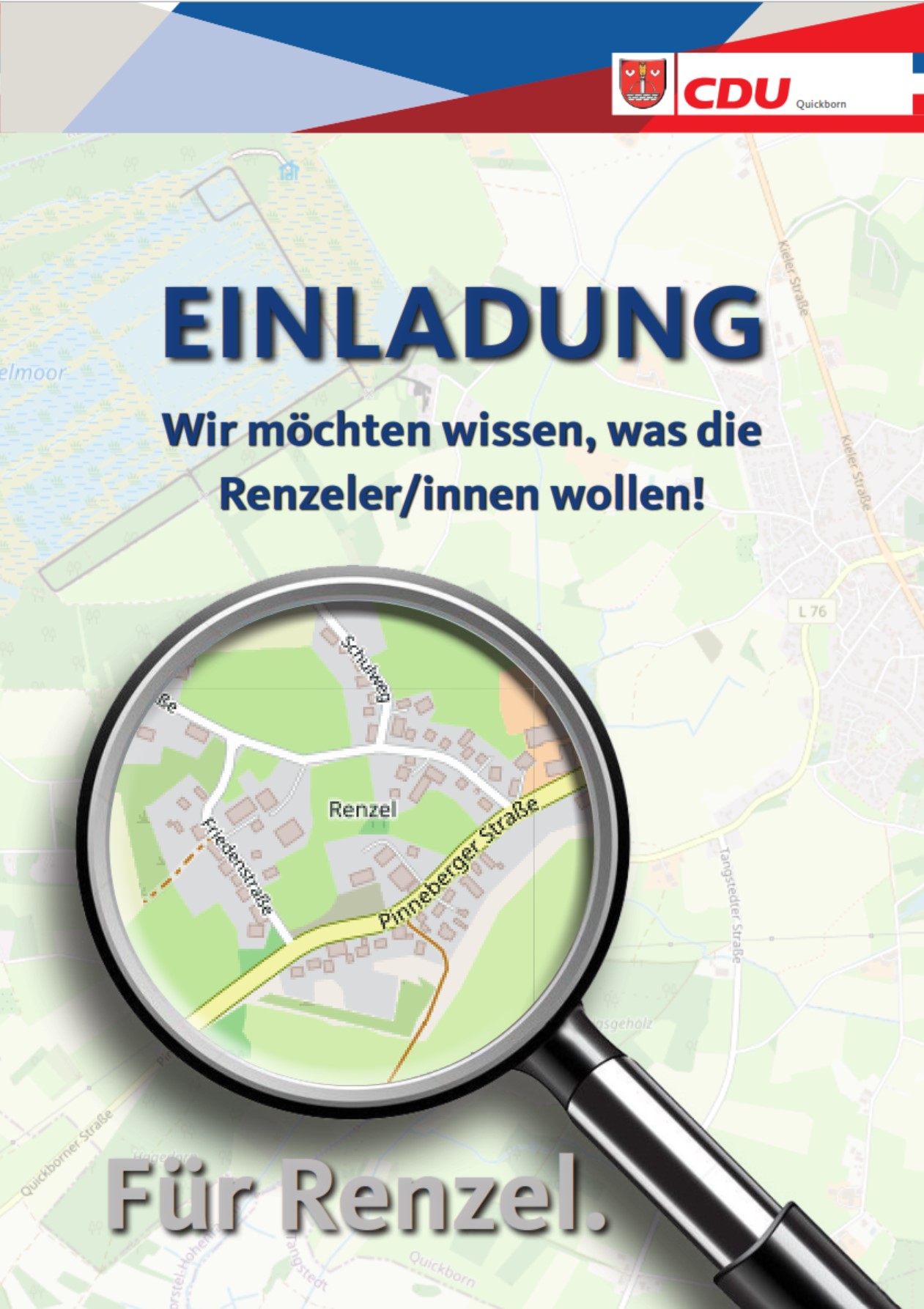 die CDU Quickborn möchte wissen, was die Renzeler/innen für Ihren Ortsteil wollen und lädt hierfür zu einer Experten-Informations- und Diskussionsrunde ein. Diese war ursprünglich am Do., 13.01.2022 um 18:00 Uhr im Dorfgemeinschaftshaus in Renzel geplant. Die aktuelle Corona-Situation hat uns allerdings veranlasst, diese Veranstaltung zu verschieben. Sie ist jetzt für den 03.03.2022 geplant.